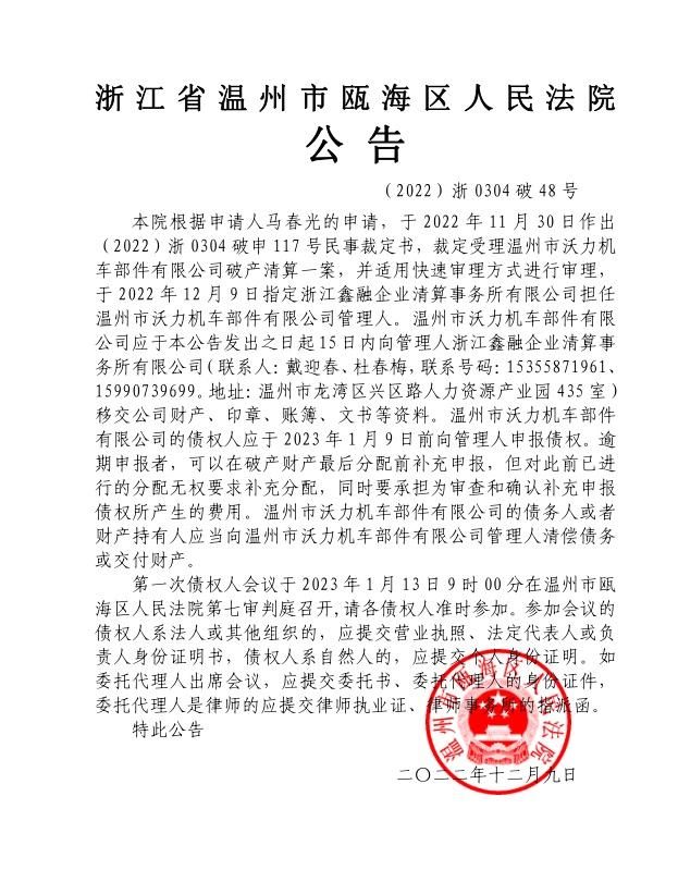 溫州市沃力機(jī)車部件有限公司破產(chǎn)清算案公告