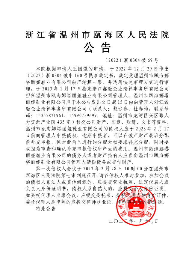 ZHEJIANG XINRONG ENTERPRISE LIQUIDATION FIRM CO.,LTD浙江省人民法院破產(chǎn)案件管理人安徽省人民法院破產(chǎn)案件管理人
