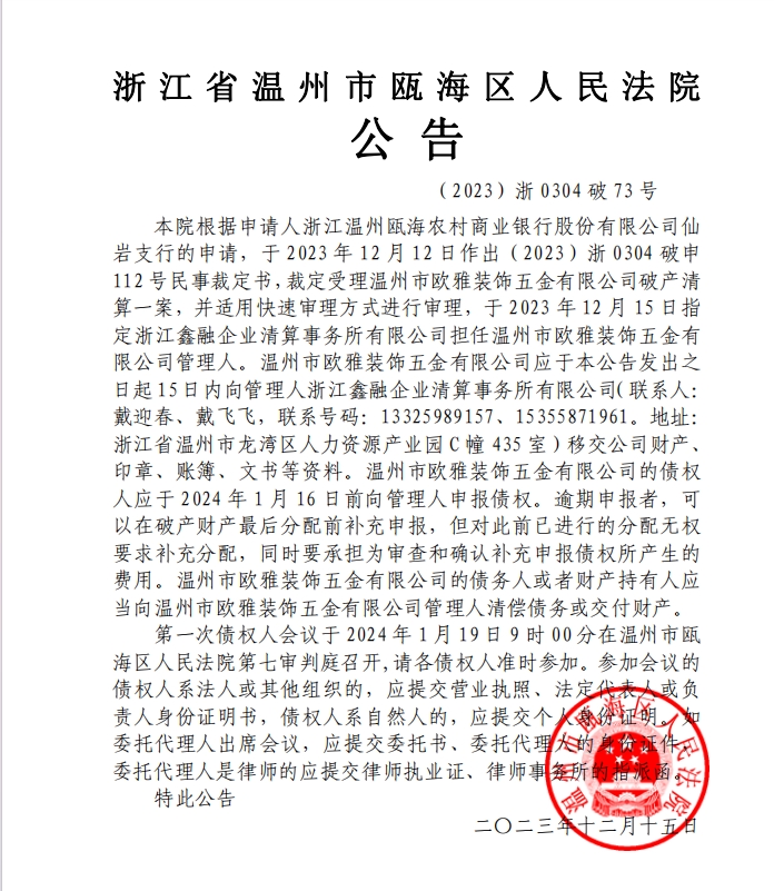 ZHEJIANG XINRONG ENTERPRISE LIQUIDATION FIRM CO.,LTD浙江省人民法院破產(chǎn)案件管理人安徽省人民法院破產(chǎn)案件管理人