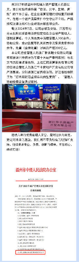 喜訊!本公司連續(xù)第六年被溫州中院評為年度優(yōu)秀管理人