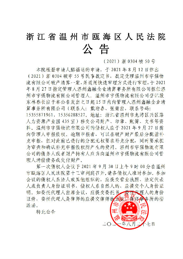 ZHEJIANG XINRONG ENTERPRISE LIQUIDATION FIRM CO.,LTD浙江省人民法院破產(chǎn)案件管理人安徽省人民法院破產(chǎn)案件管理人
